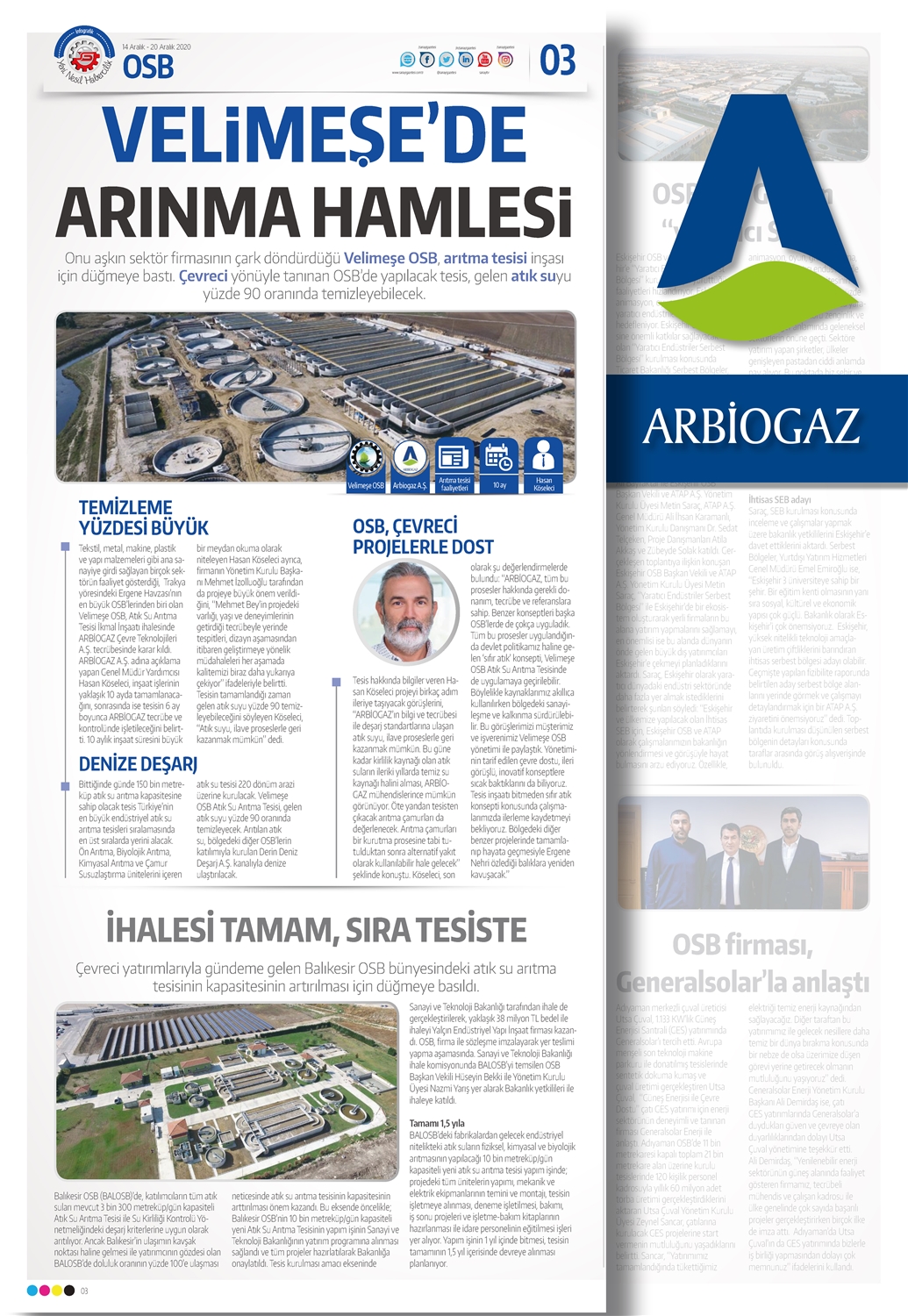 Tekstil, metal, makine, plastik ve yapı malzemeleri gibi ana sanayiye girdi sağlayan birçok sektörün faaliyet gösterdiği, Trakya yöresindeki Ergene Havzası’nın en büyük OSB’lerinden biri olan Velimeşe OSB, Atık Su Arıtma Tesisi İkmal İnşaatı ihalesinde ARBİOGAZ Çevre Teknolojileri A.Ş. tecrübesinde karar kıldı. ARBİOGAZ A.Ş. adına açıklama yapan Genel Müdür Yardımcısı Hasan Köseleci, inşaat işlerinin yaklaşık 10 ayda tamamlanacağını, sonrasında ise tesisin 6 ay boyunca ARBİOGAZ tecrübe ve kontrolünde işletileceğini belirtti. 10 aylık inşaat süresini büyük bir meydan okuma olarak niteleyen Hasan Köseleci ayrıca, firmanın Yönetim Kurulu Başkanı Mehmet İzolluoğlu tarafından da projeye büyük önem verildiğini, “Mehmet Bey’in projedeki varlığı, yaşı ve deneyimlerinin getirdiği tecrübeyle yerinde tespitleri, dizayn aşamasından itibaren geliştirmeye yönelik müdahaleleri her aşamada kalitemizi biraz daha yukarıya çekiyor” ifadeleriyle belirtti. Tesisin tamamlandığı zaman gelen atık suyu yüzde 90 temizleyebileceğini söyleyen Köseleci, “Atık suyu, ilave proseslerle geri kazanmak mümkün” dedi.